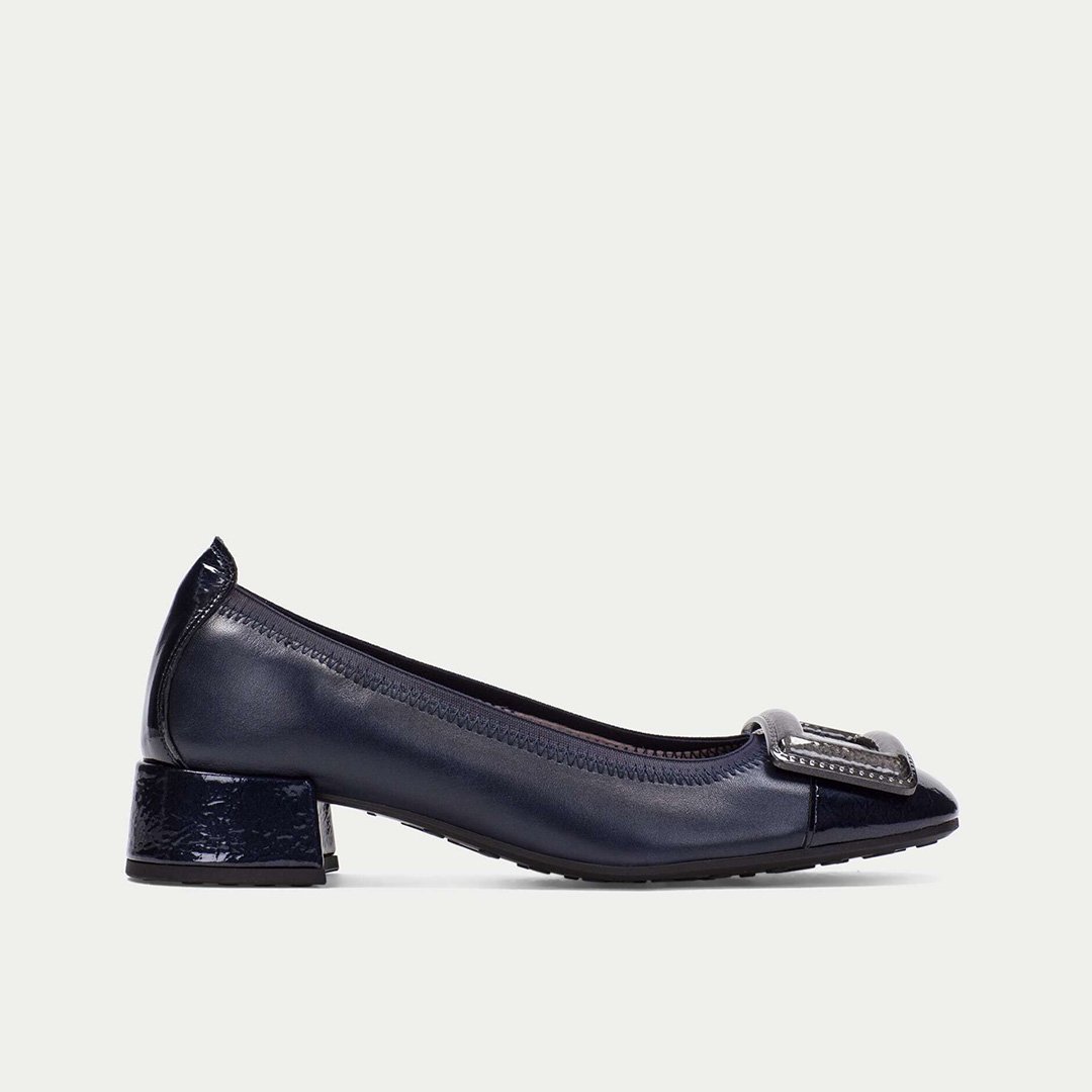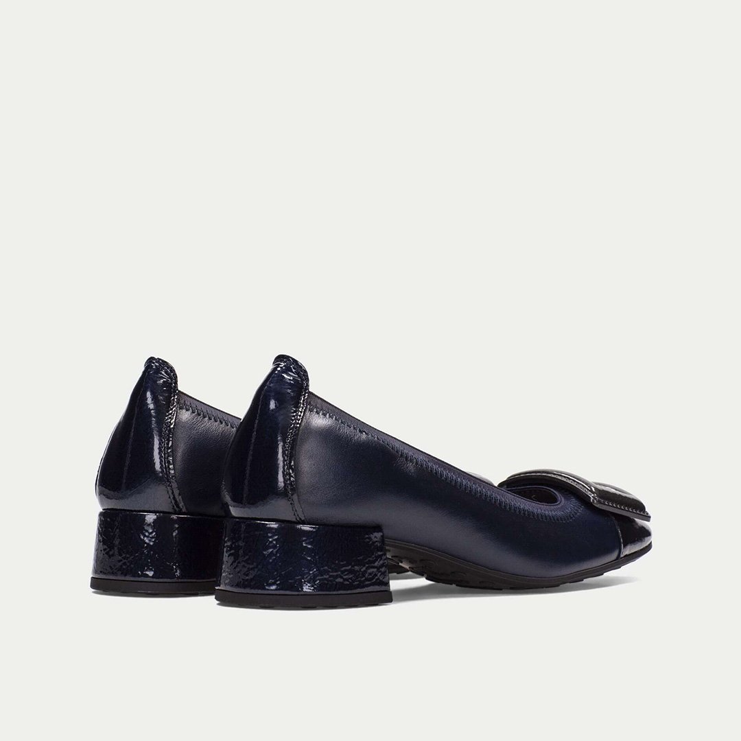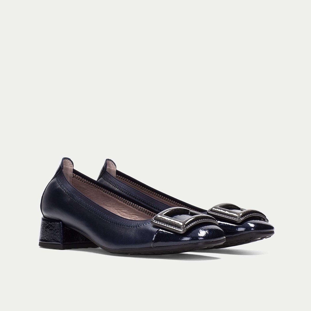 The patent toe panel and low 3 cm block heel add a modern, elegant touch.