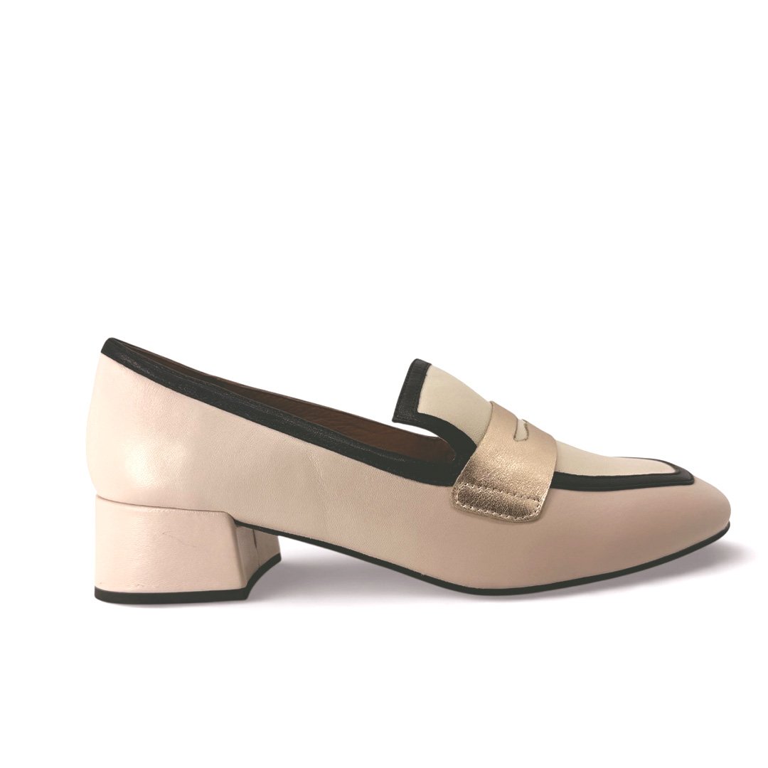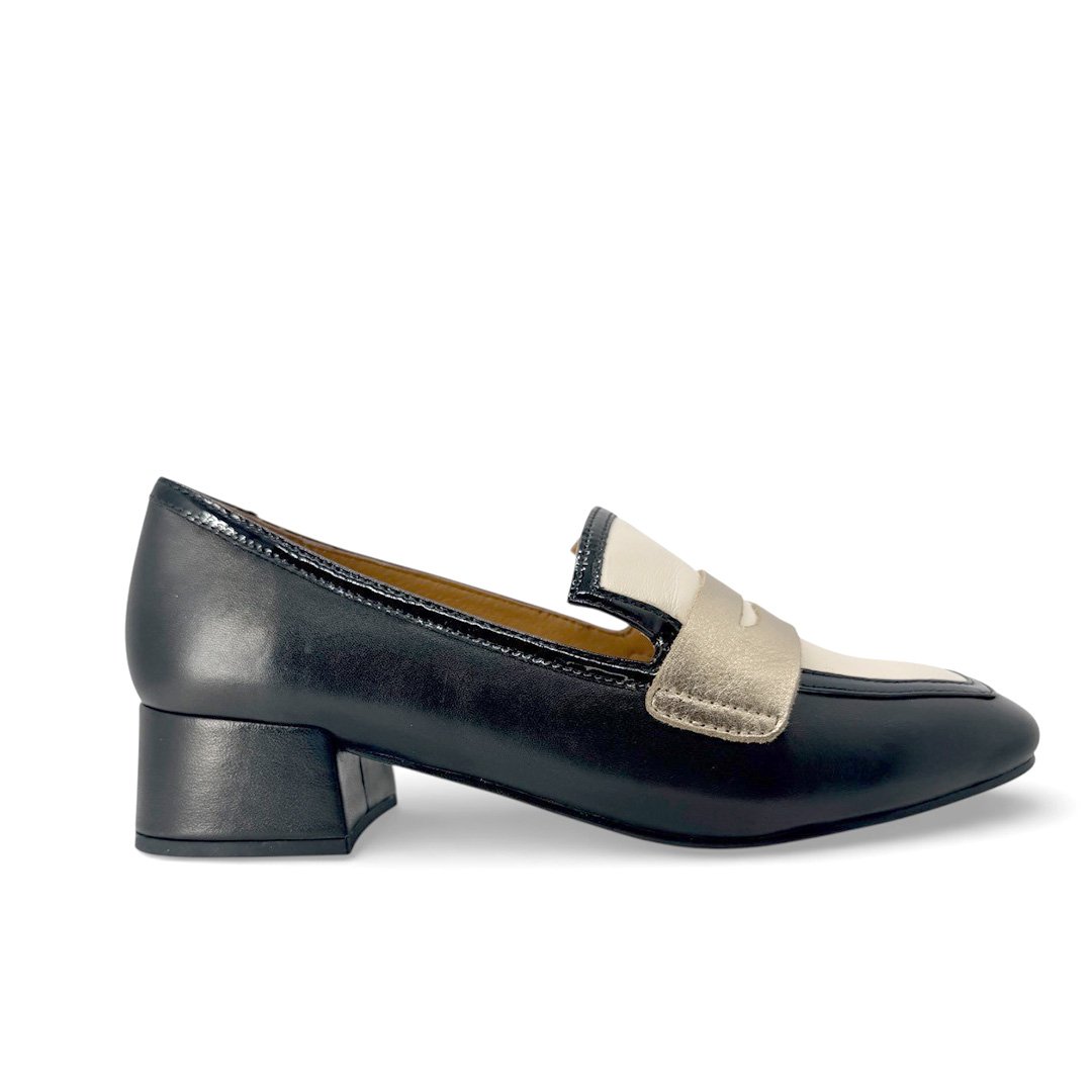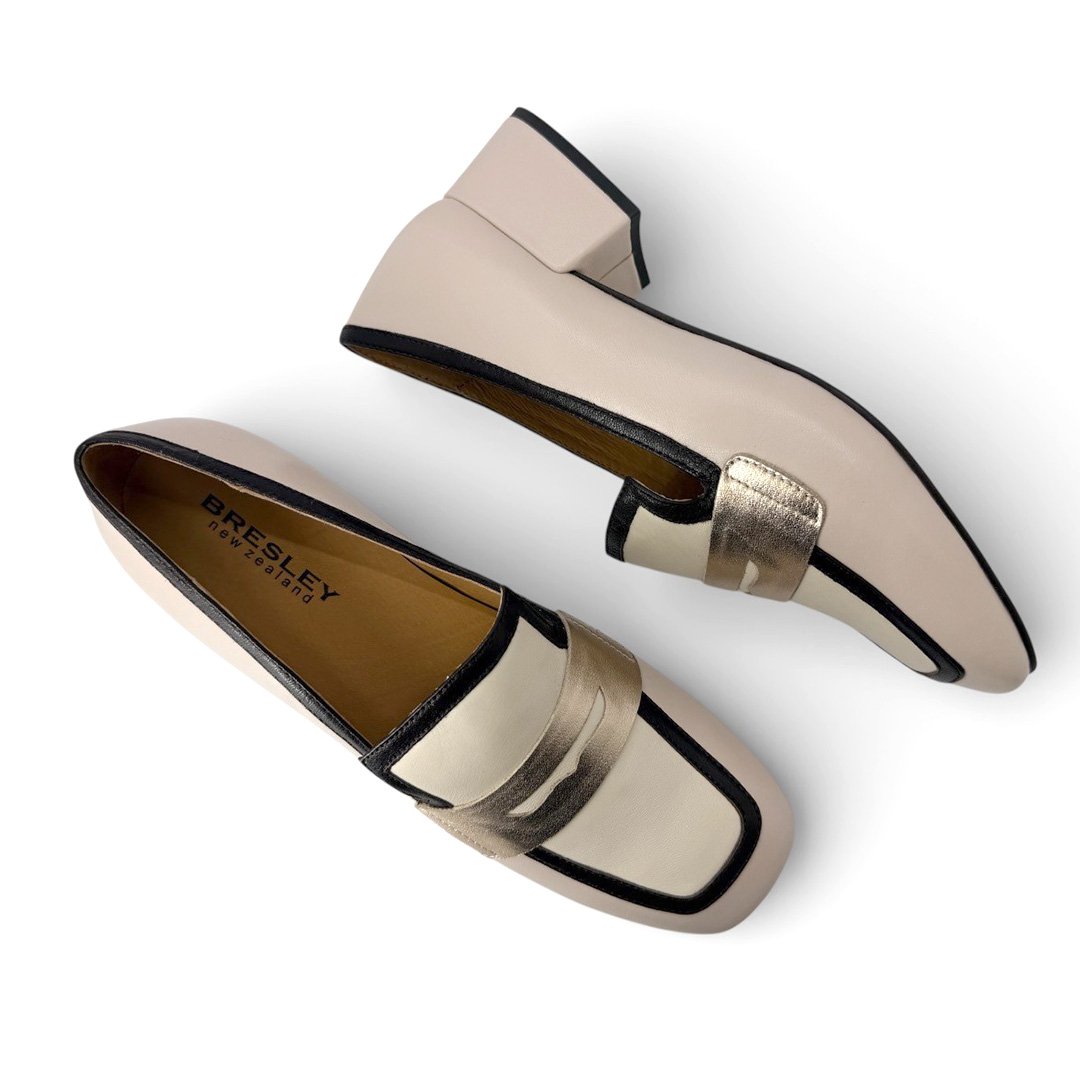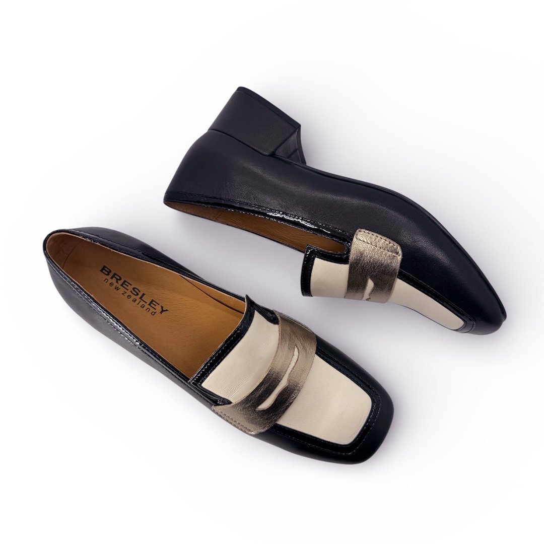 Perfect with tailored trousers, cropped pants, or a sleek midi skirt, the Bresley Denial loafer brings modern contrast and refined metallic detail to any wardrobe.