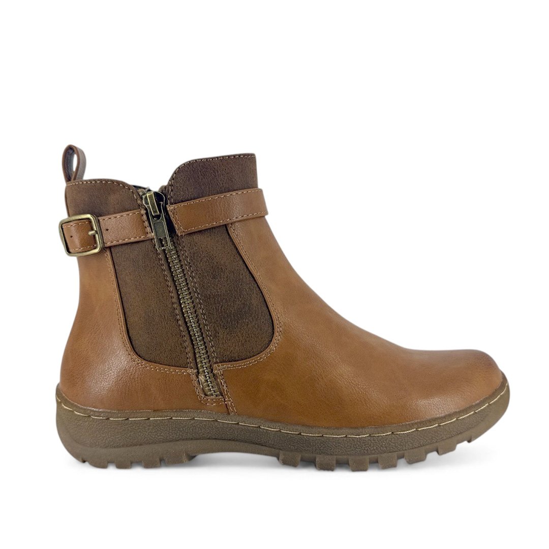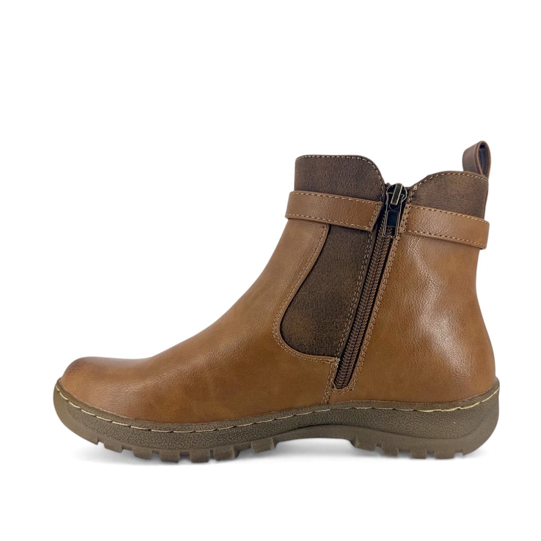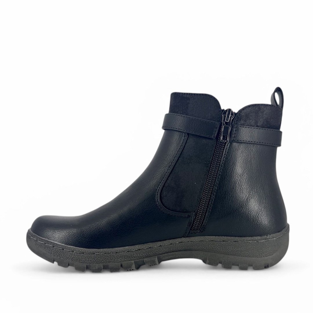 Refined and effortlessly versatile, this ankle boot brings together sleek design with everyday practicality. Featuring a smooth, leather-look finish paired with soft suede textures, it creates a sophisticated contrast that elevates any winter outfit. A decorative strap with a metallic buckle adds a polished edge, giving this style a touch of modern flair.