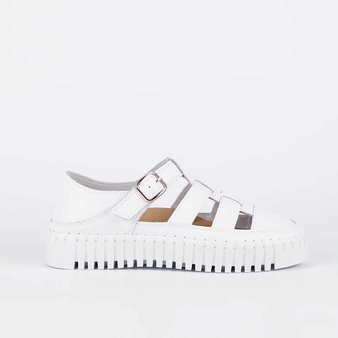 Modern and fresh, the Maisy sandal is your go-to for chic summer style. Made from soft white leather with wide straps, a statement platform sole, and buckle detail, it’s the perfect blend of elevated and easy.