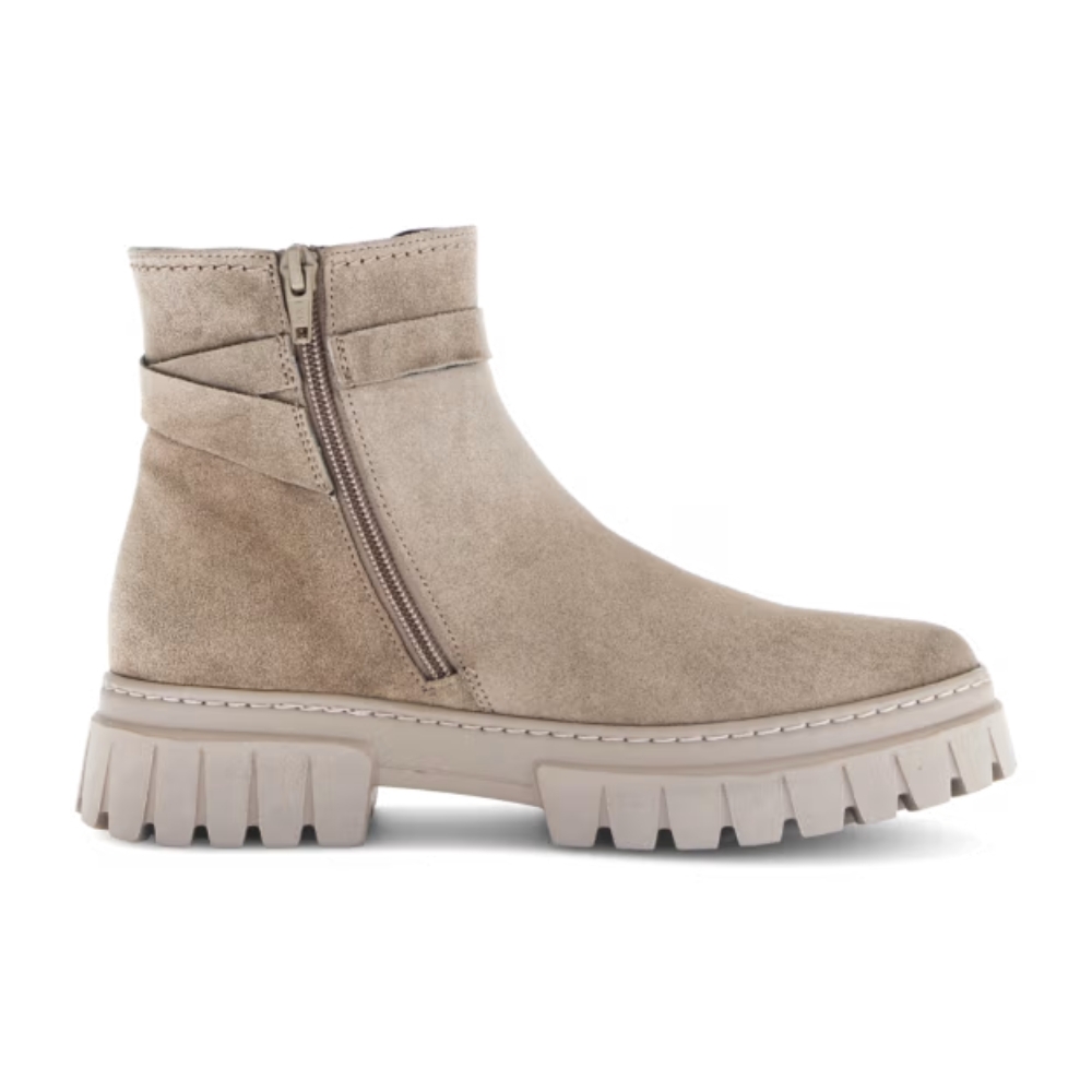 Gabor Minka in Taupe suede captures the look of the boot you’ve shown perfectly — a soft beige/taupe suede ankle boot with a chunky, modern sole and subtle statement hardware at the side. Designed with a clean upper and a practical side zip, it balances everyday comfort with a slightly elevated, fashion-forward edge thanks to its lug-style outsole and stable block heel.