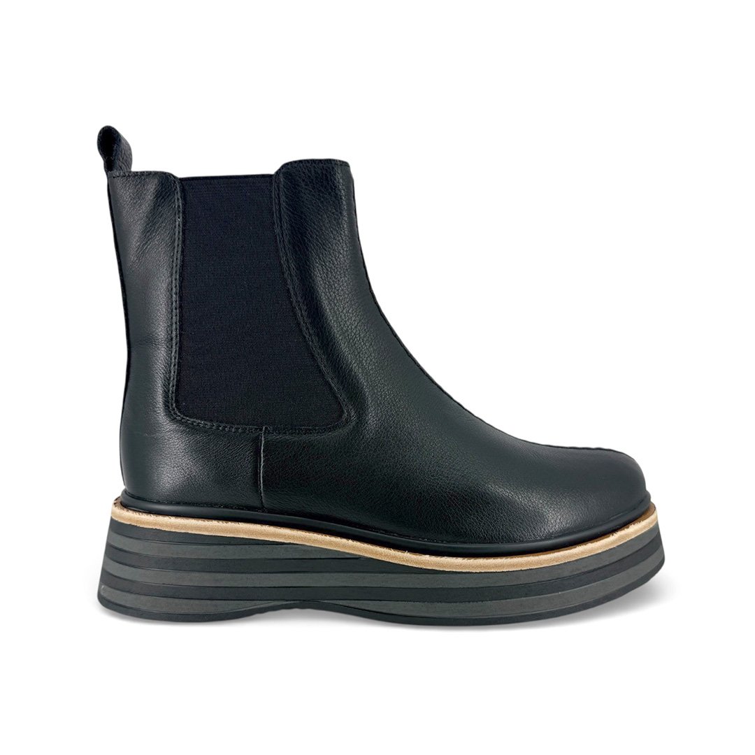 The Molten boot by Alfie & Evie puts a modern twist on the classic Chelsea style. Crafted from soft black leather, it features elastic side panels, an inside zip for easy wear, and a pull tab at the heel. Finished with a bold layered platform sole, Molten offers everyday comfort with a contemporary edge.