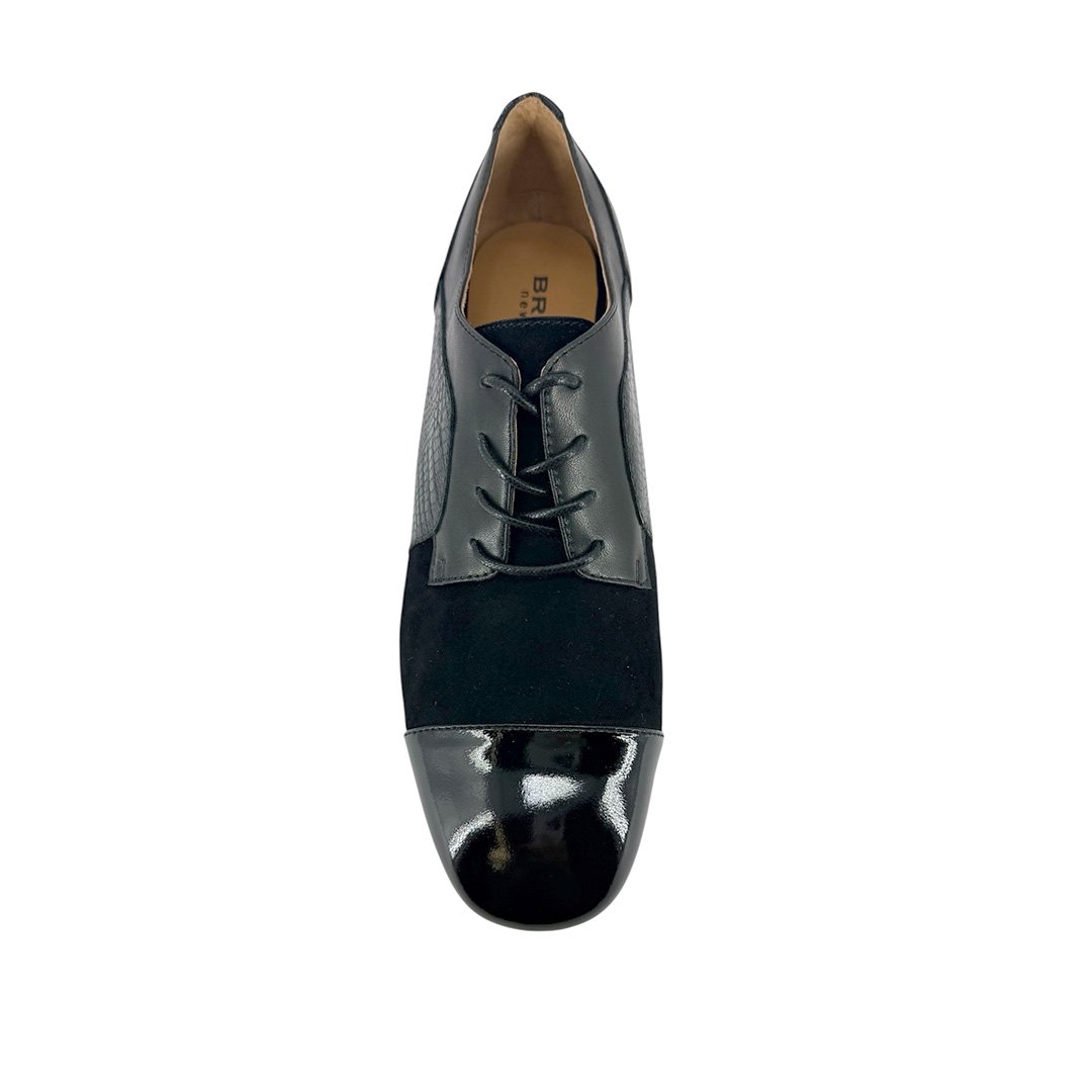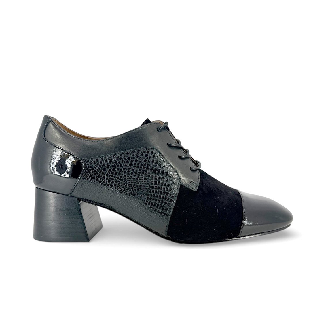 Elevate your everyday style with the Bresley Peg, a sophisticated black lace-up heel crafted with a striking mix of smooth leather, reptile-embossed texture, and soft suede detailing. The sleek almond toe is finished with a glossy leather cap for a polished, fashion-forward touch, while the adjustable lace-up front ensures a secure, flattering fit.