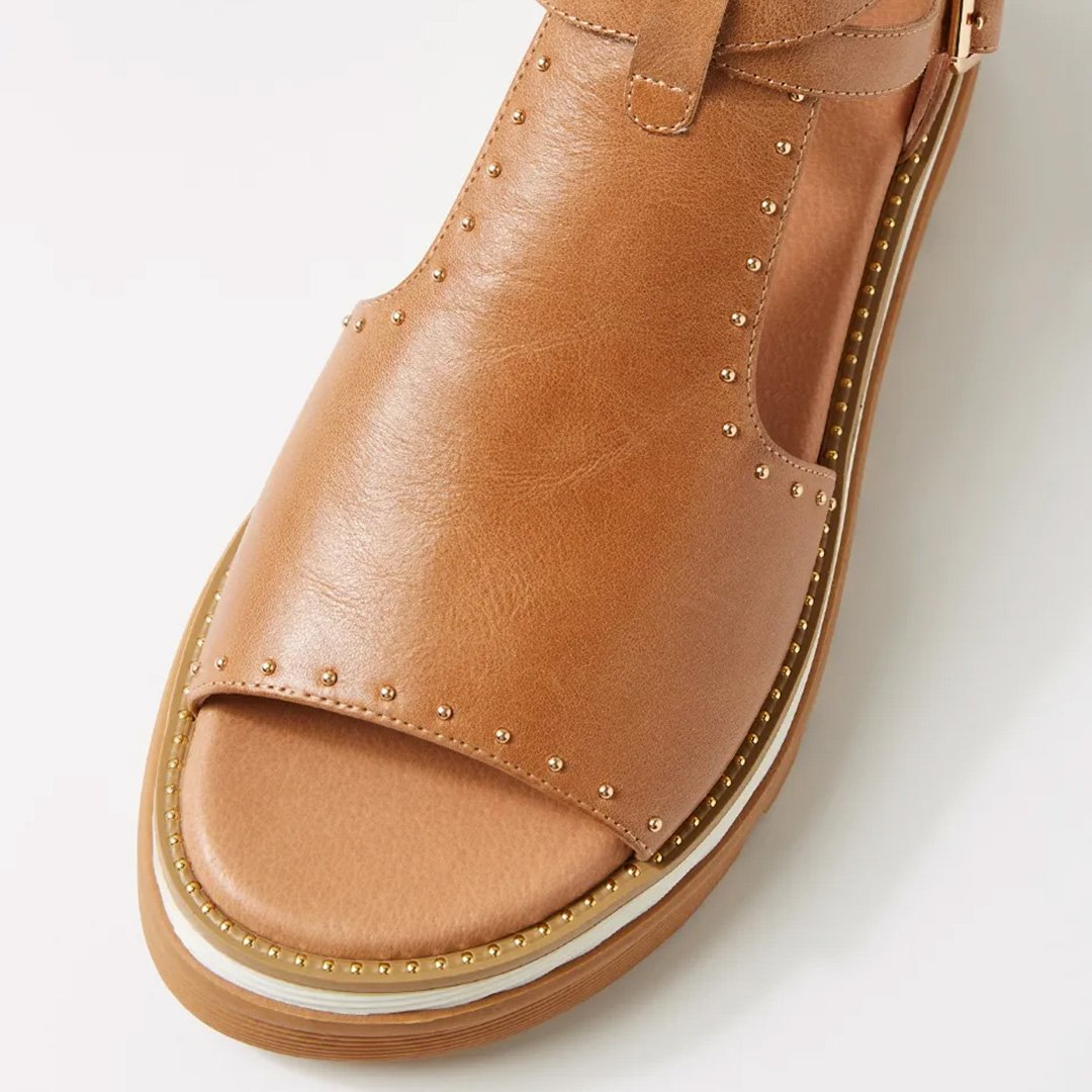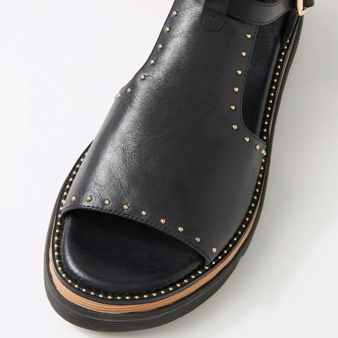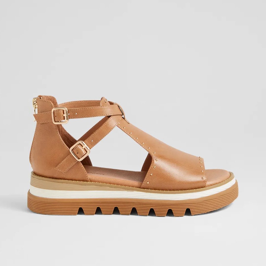 Guaranteed to elevate any look, SORENS by Django & Juliette is a chic leather sandal that offers a refined alternative to traditional heels. Set on a 4.7cm platform wedge, it features twin buckle straps, subtle stud embellishments, and a convenient rear zip for easy wear. Whether you're dressing up or keeping it casual, SORENS delivers effortless sophistication with a comfortable boost.